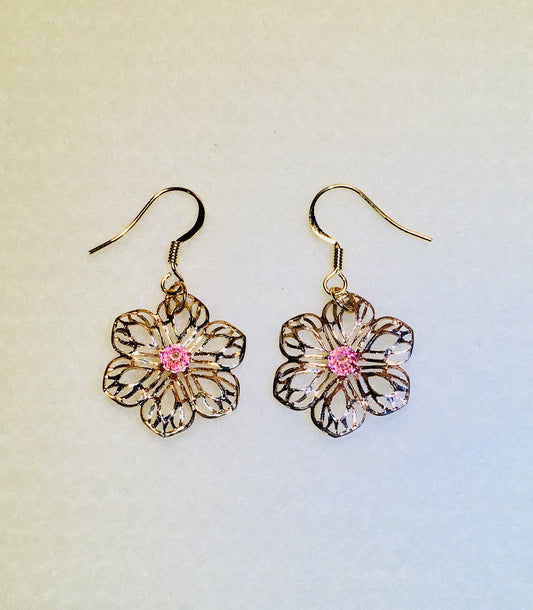 14K Gold Plated Filigree Flower Earrings with Pink or Blue Swarovski Crystals, 38L x 21W mm