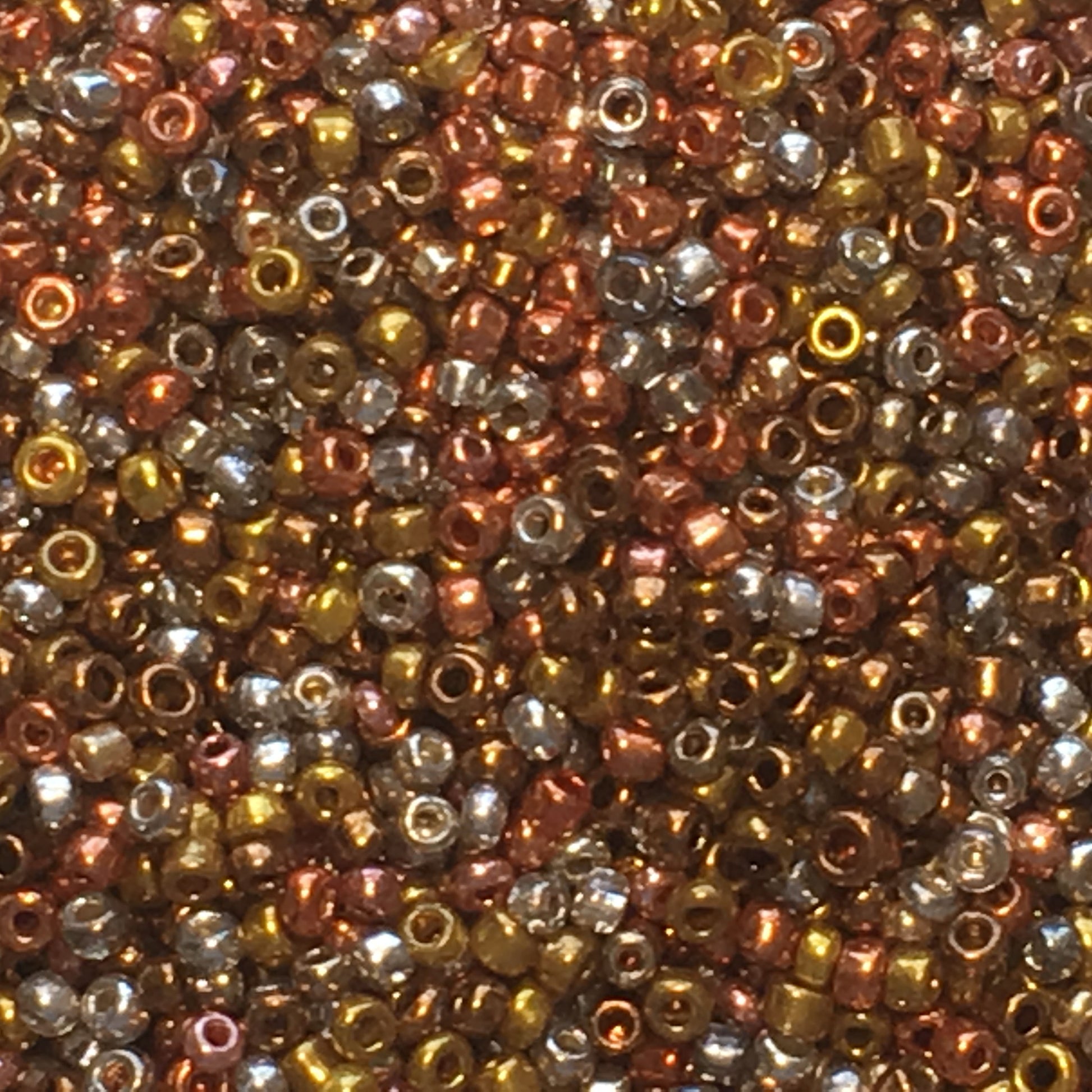 8/0 - 11/0 MIX měď, zlato, bronz, stříbro, stříbrem lemované křišťálové perličky, 5 nebo 10 g