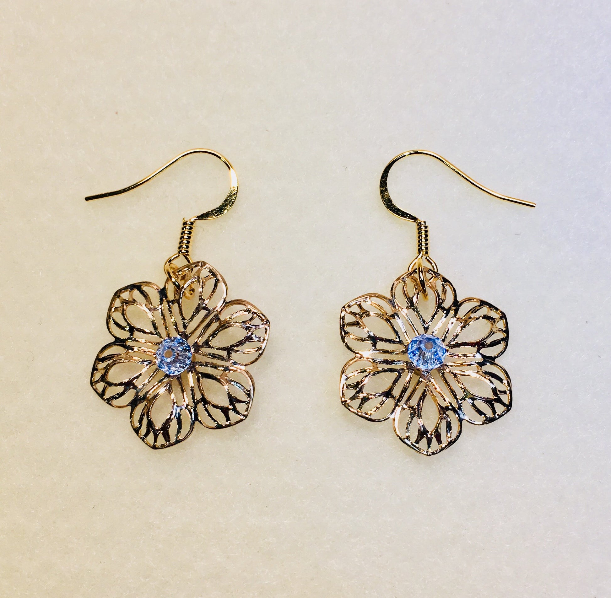 Náušnice filigránové květiny pozlacené 14K zlatem s růžovými nebo modrými krystaly Swarovski, 38L x 21W mm