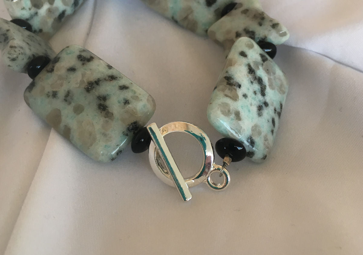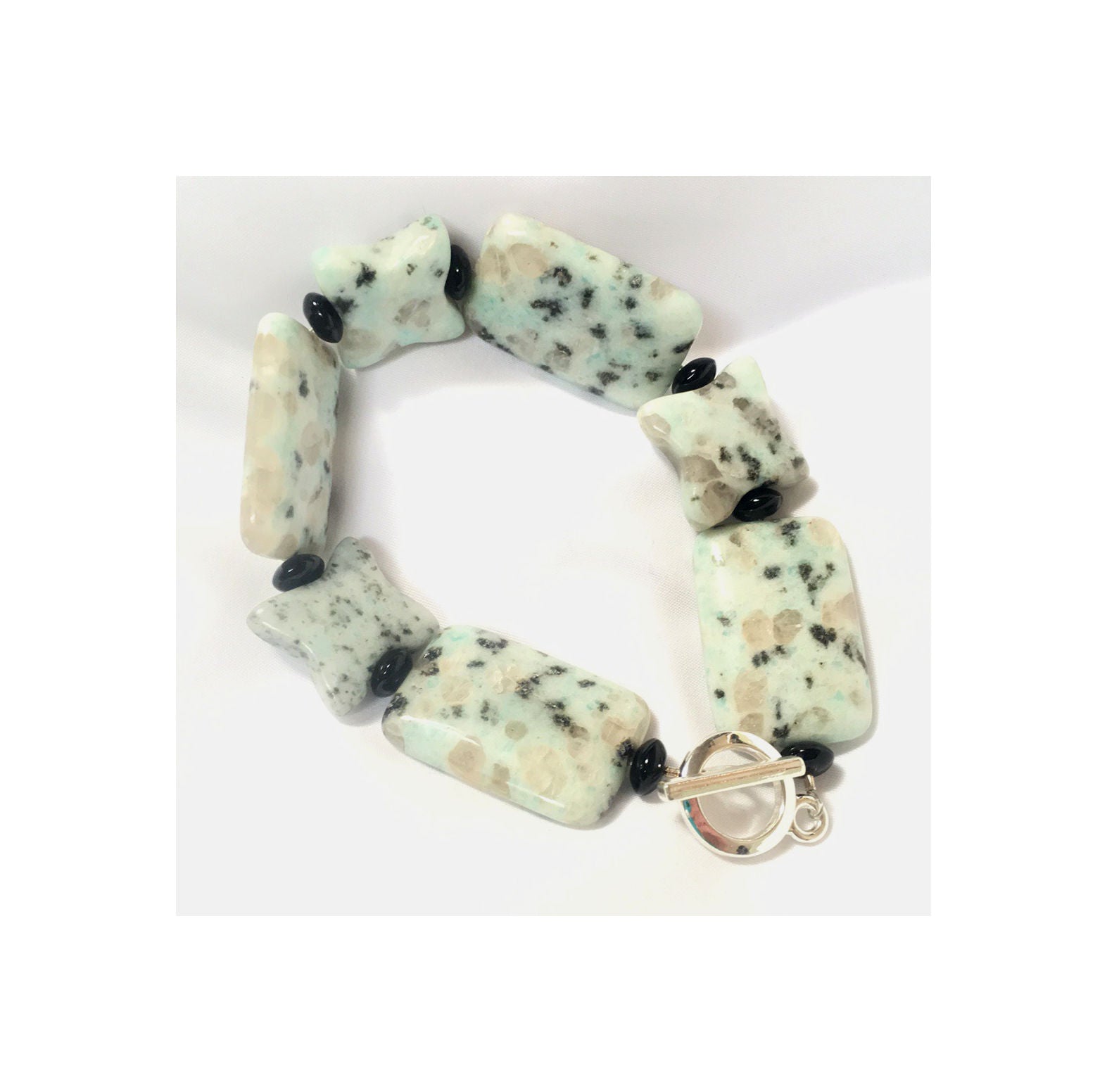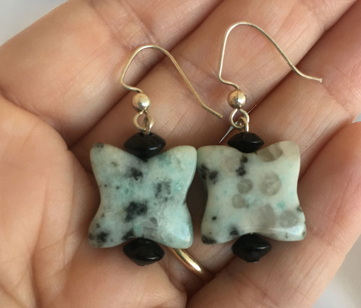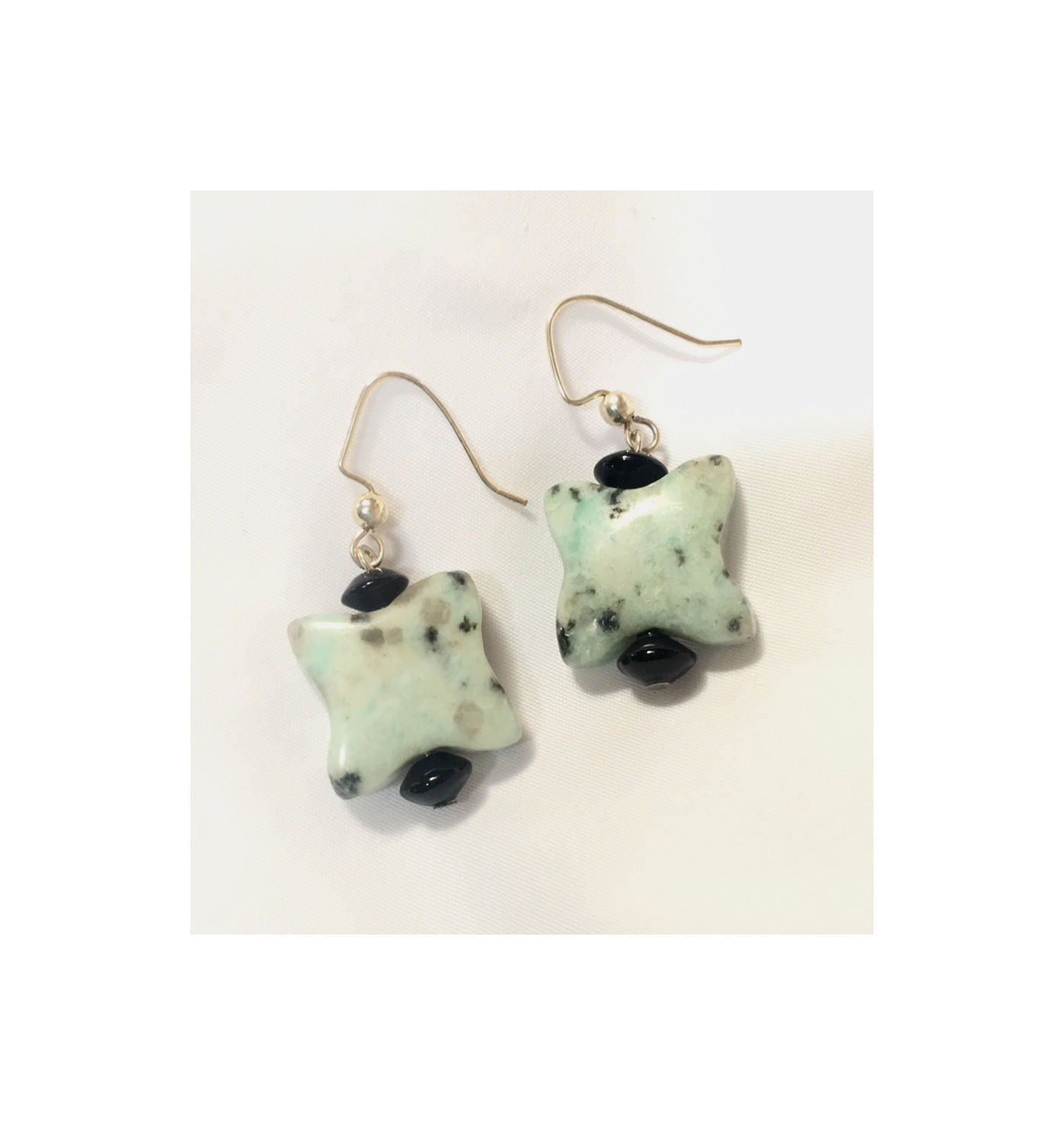 Tyto krásné kameny jsou ručně vyřezávané v kombinaci šedé a černé v zelené části kamene. Odděleno černým skleněným diskem Korálky se stříbrnou přepínací sponou a ušními dráty.