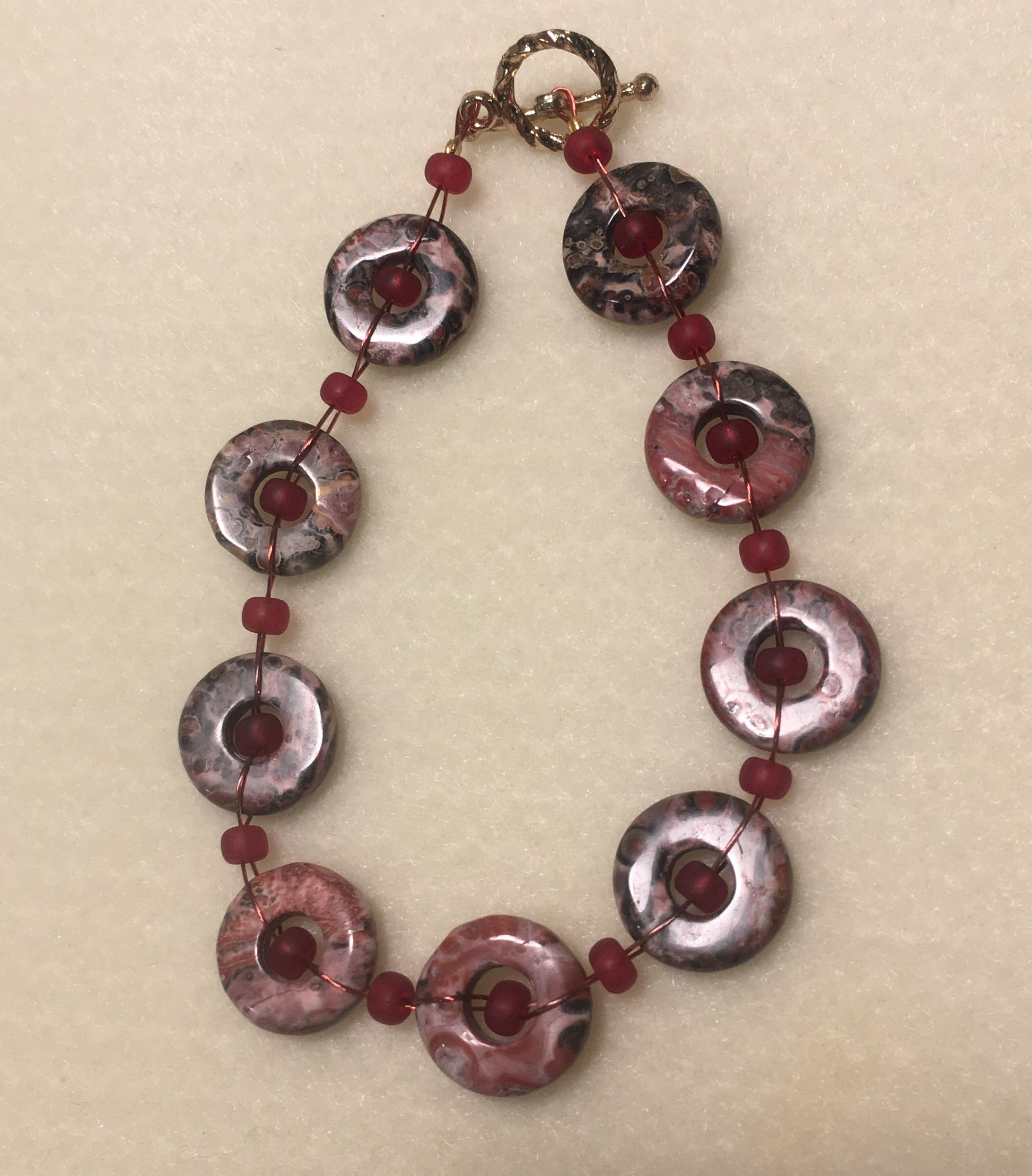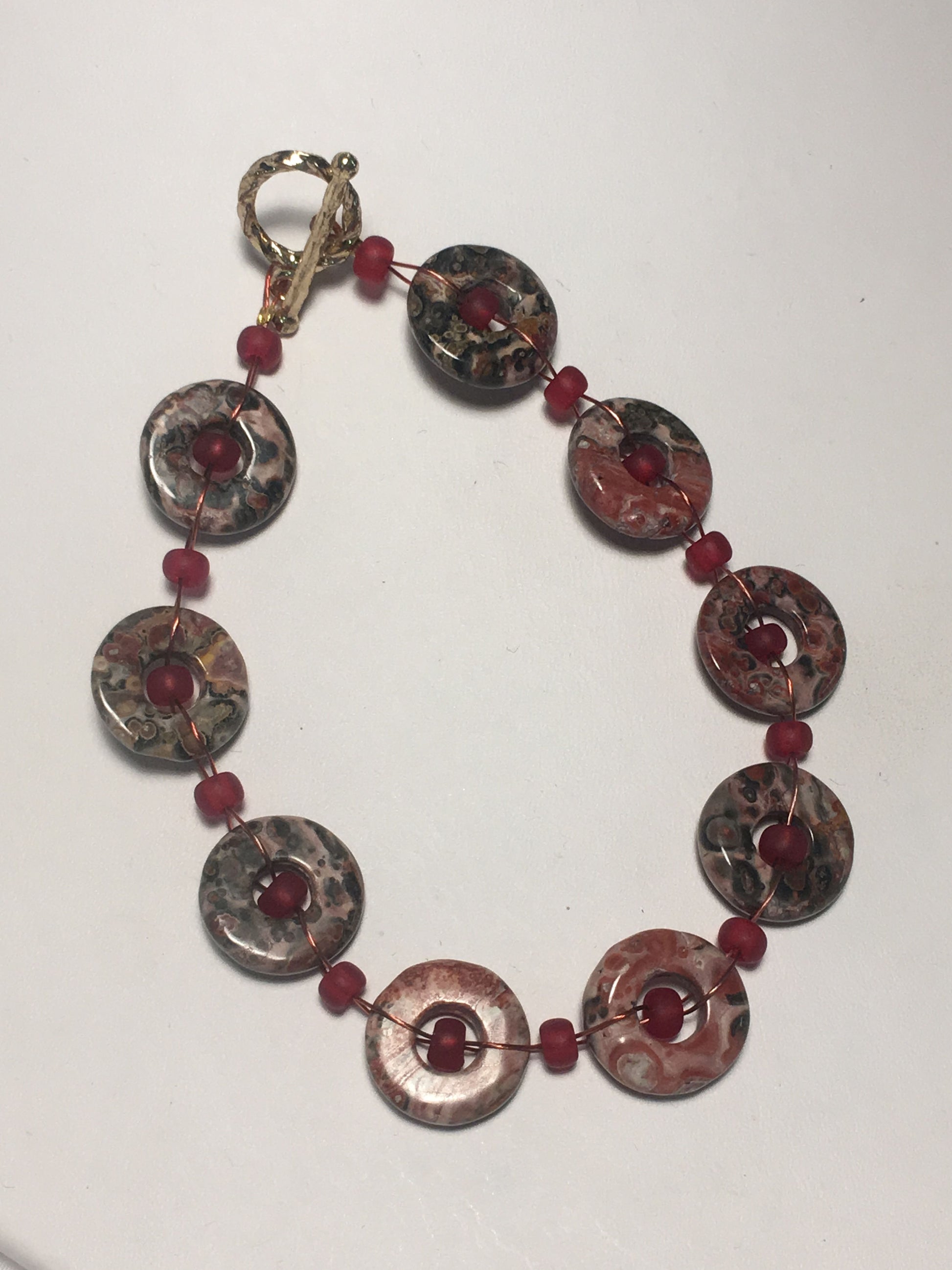 Kulaté kruhy z krásného jaspisu z leopardí kůže tkané jedním červeným korálkovým drátem s matnými červenými skleněnými perličkami a 14karátovým zlatem potaženým krouceným zapínáním. Jedná se o JEDINOU položku.