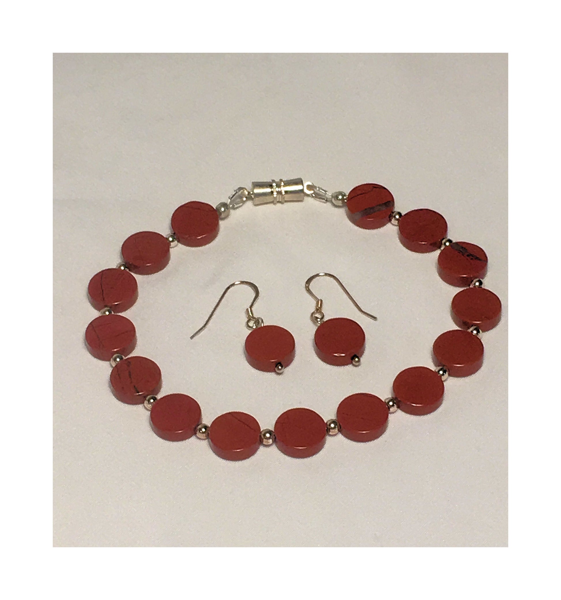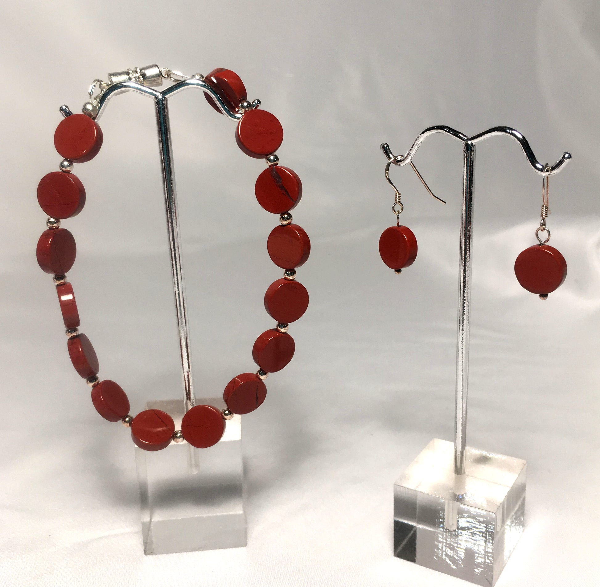 Ploché kruhy červeného jaspisu oddělené postříbřenými korálky. Odpovídající visací náušnice na ušních drátcích ze sterlingového stříbra.