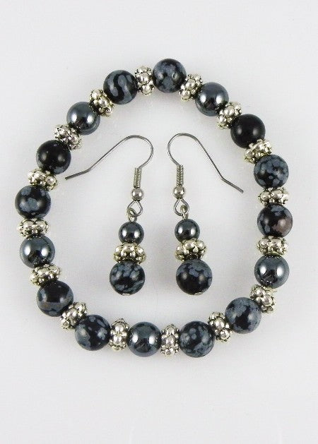 Korálky z polodrahokamu sněhové vločky se stříbrnými korálky Bali na natahovací šňůrce dělají z tohoto náramku velmi pohodlný náramek. Náušnice jsou hypoalergenní ušní dráty z nerezové oceli.