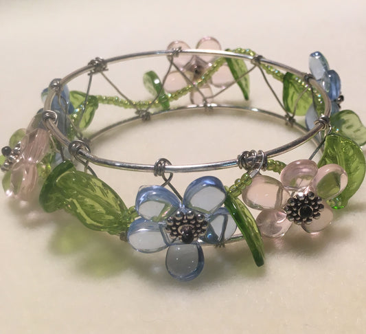 Bracelet en verre blanc moucheté bleu et perles d’argent