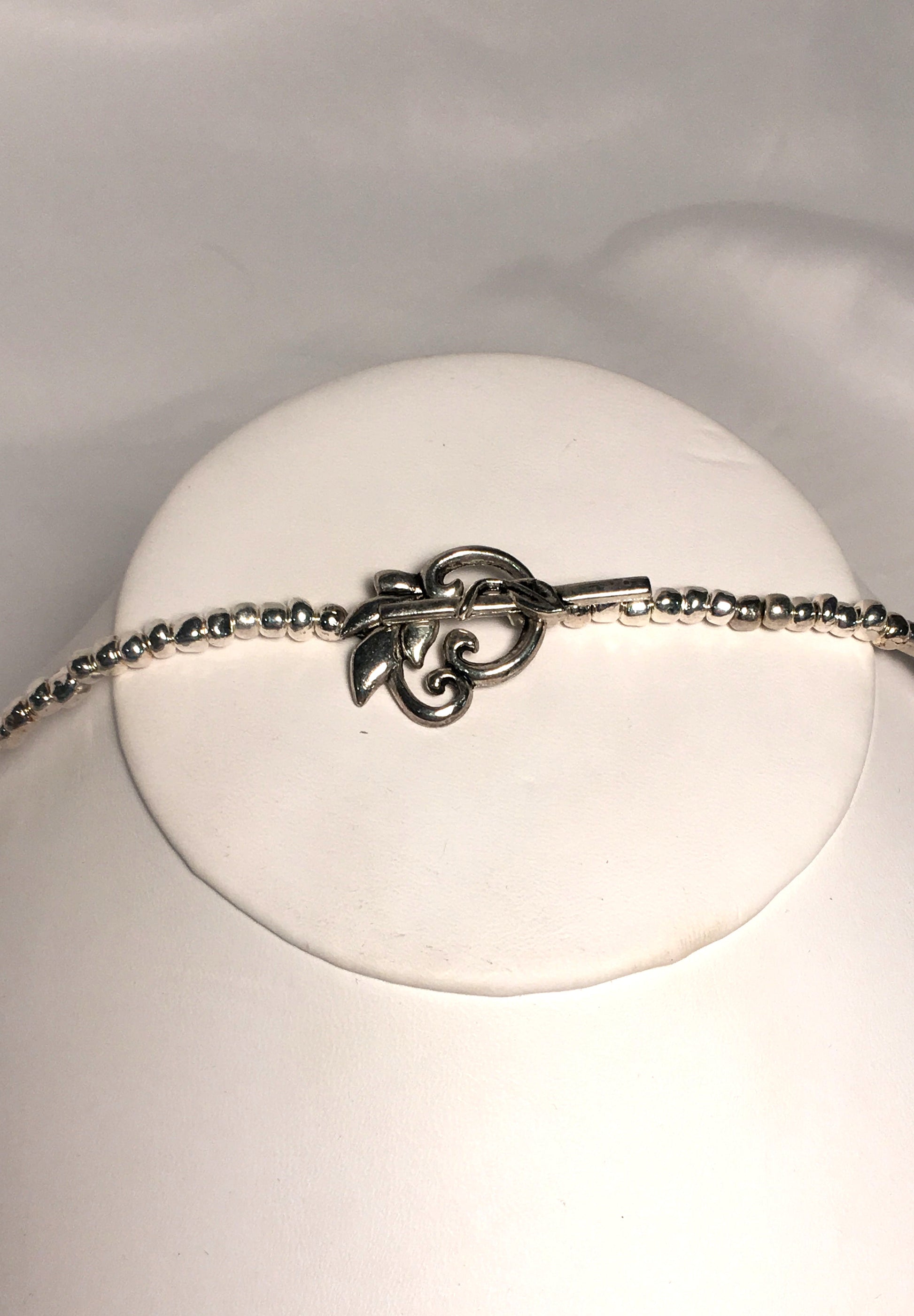 Pendentif tube aplati en jade semi-précieux sculpté avec rondelles de jade et perles rondes en pierre de Picasso séparées par des perles de rocaille plaquées argent avec fermoir à bascule. Fils d’oreilles en argent sterling.